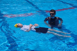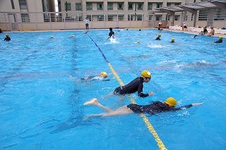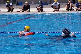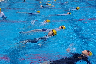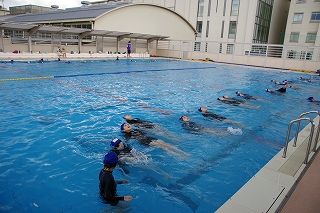 上の学年になると、だるま浮き、伏し浮きに加え、おぼれそうになった時に上を向いた状態で救助を待つ「浮いて待て」の姿勢、さらにエレメンタリーバックストローク(背浮き状態での平泳ぎのキック)も練習しました。