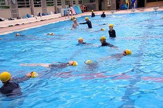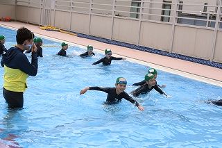 6年生はさらに水難事故にあった場合にも落ち着いて自分の命を守れるよう、水深を155cmに設定して着衣泳も経験しました。(NDダイアリーをご覧ください。)