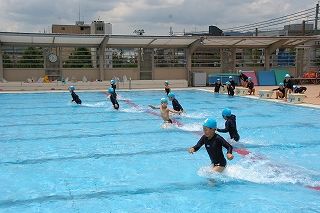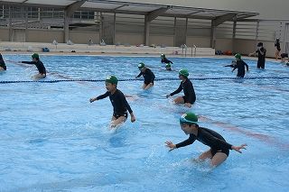 水に慣れるためにプールを浅くして、歩いたり、走ったり、手をついて「ワニさん歩き」をしたりできるのは本校の可動床プールならではの活動です。