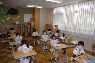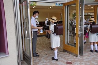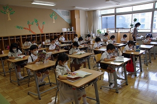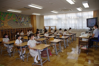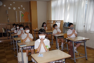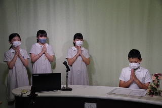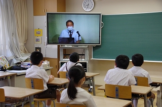 テレビ放送を通じて全校で朝の祈りをささげた後、校長先生の話を聞きました。