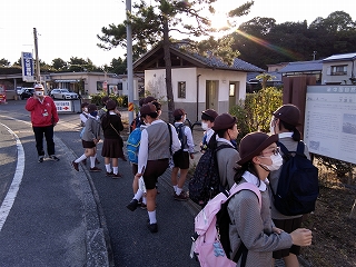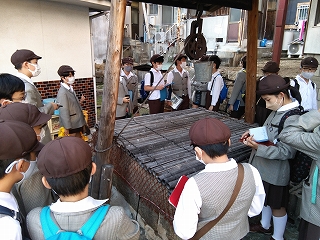続いて、下津井の街を散策しました。ここでも江戸時代や明治時代からの歴史ある建物を見ることができます。なまこ壁や北前船の歴史についてのお話を聞きながら歩きました。京都とはまた違った趣の古い街並みに子ども達は興味津々の様子でした。