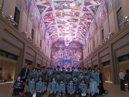 集合写真は、”システィーナ礼拝堂”で撮影しました。天井の絵のひとつに「アダムの創造」があります。ノートルダム学院小学校にもある絵を本物のような迫力で見ることができました。