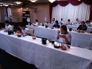 夕食には美味しい郷土料理をたくさんいただきました。土佐赤牛のすき焼きや、四万十鶏のソテーなど、みんな笑顔で堪能していました。