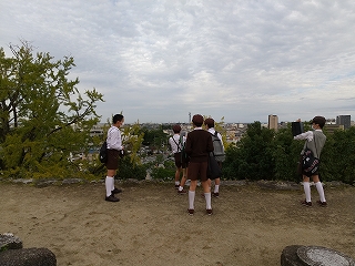 その後、松阪城跡の石垣を登り、街を一望する景色を楽しみました。お城は現存していませんが、石垣は壮大なものでした。石垣の上は、柵がなく、スリル満点でした。