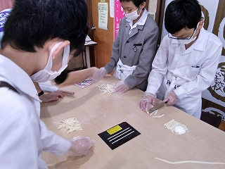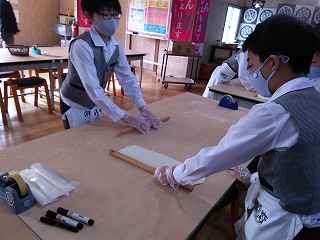 こねられた生地をのばして切る作業、そして小麦粉と塩水から生地を作る作業を体験しました。音楽に合わせながらリズムよく、楽しくうどん打ちをすることができました。どちらもお土産として持ち帰ります。