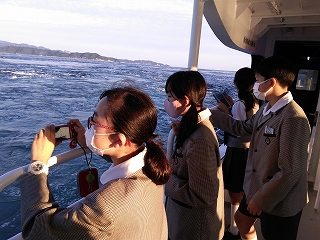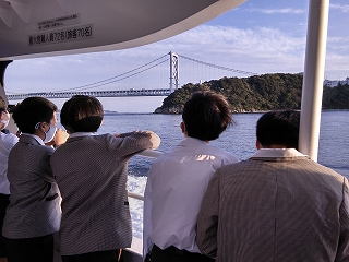 2日目の最後は、うずしお観潮船「アクアエディ」に乗りました。船の上からはもちろん、船中からも水面下1メートルの様子を見ることができます。うずしおの泡の粒も間近で観察することができました。