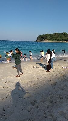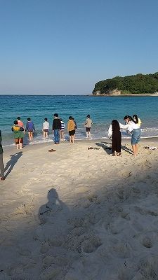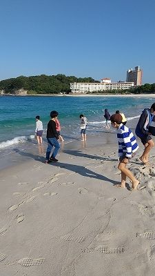 とても良いお天気の朝を迎えました。ホテルを出発する前に白良浜海水浴場で青い空と青い海の景色を眺めました。裸足になって波打ち際で、きれいな白い砂浜も楽しみました。