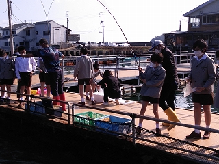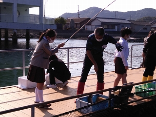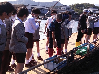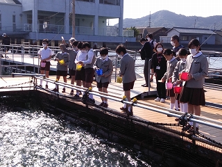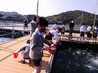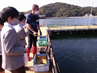 その後ハマチの餌やり体験をしました。ハマチの養殖のためにつくられた特別な餌を投げ込むと、何匹ものハマチが水しぶきをたてて集まってきて迫力満点でした。