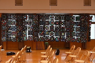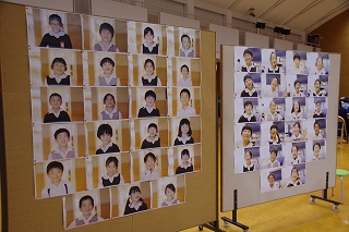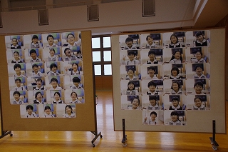 会場となった講堂では、子ども達の作品と共に子ども達一人ひとりの笑顔の写真でお家の方をお迎えしました。
