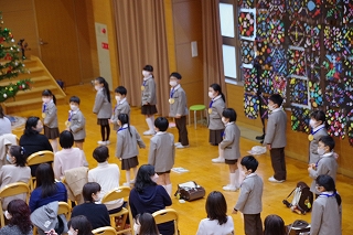 子ども達がスマイリンピック旗と入場し、英語のお祈りで開会します。