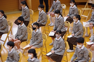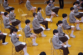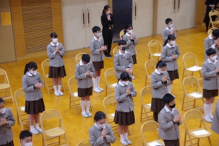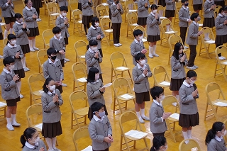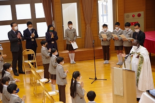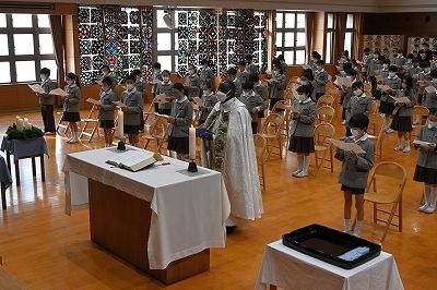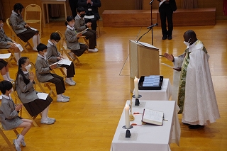 例年は聖堂で行っていますが、今年度も新型コロナウイルス感染予防の観点から、講堂で行いました。