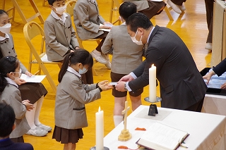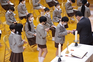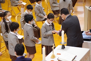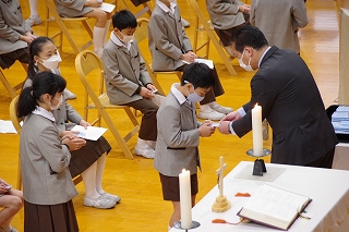 神父様に祝福していただいた十字架を一人ずつ、校長先生から受け取りました。この十字架をお守りにして、一人ひとりがこれから先の試練を乗り越えていってほしいと願っています。