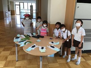 2年生の生活科の学習では、屋上庭園の畑で5つの野菜、オクラ・ナス・キュウリ・トマト・ズッキーニを育てました。そして、その野菜たちを自分たちが運営するお店で販売するという活動に取り組んでいます。
