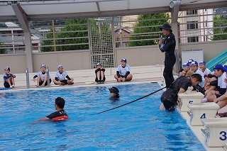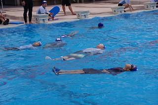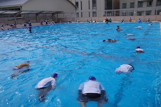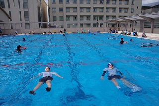 後ろ向けに落ちて、背浮きをする練習もしました。海や川や湖に着衣のまま落ちるような事態になったら、とにかく息ができるように上を向いて浮き、助けが来るまで待たなければいけません。いざという時の「浮いて待て」は授業でも何度も練習してきました。