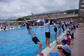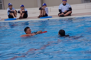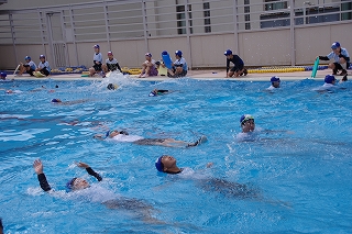 子ども達は水着を着た上から、体操服などの衣服を着用してプールサイドに集合しました。まずは、服を着たまま泳ぐ体験をしました。水着の時とは勝手が違います。
