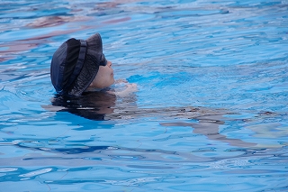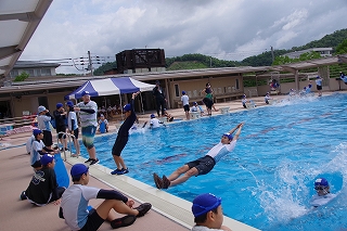 足が届かないところで服だけでなく靴もはいたまま水に落ちた場合を想定して飛び込み、その後だるま浮きで浮いてみました。