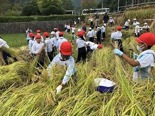 4年生は今日、山の家で「もち米の稲刈り」を行いました。