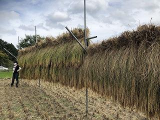 刈り取った稲穂を束ねて麻ひもで縛り、それを「稲木」に吊って乾燥させます。