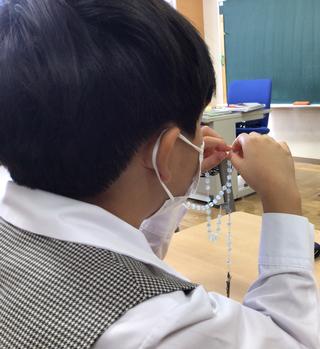 10月は、ロザリオの月です。1年生も、ピカピカの自分のロザリオを使って一生懸命お祈りをしています。