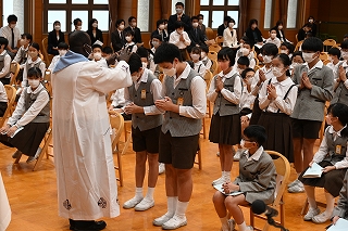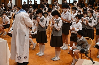 神父様からひとりずつ按手(あんしゅ)し、祝福していただきました。