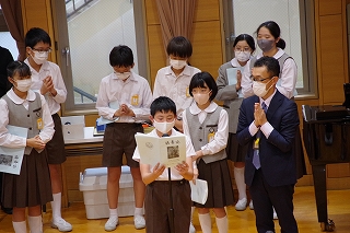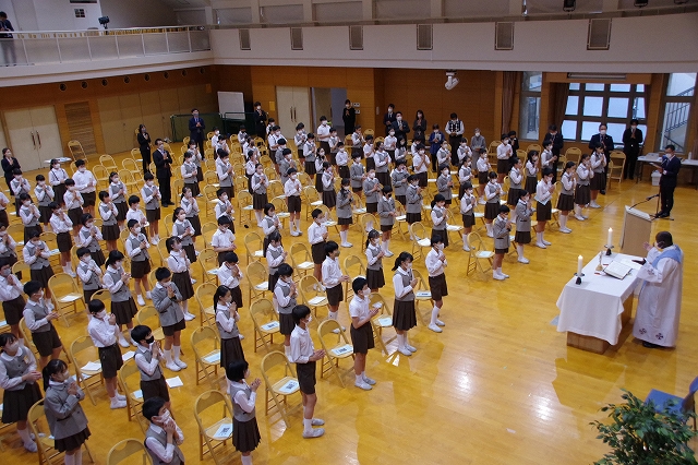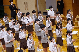 代表の児童が今日一日をふり返って祈りをささげ、皆で共に祈りました。