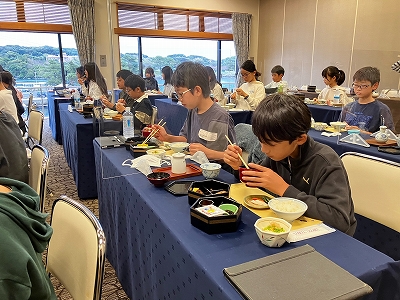 入浴後は夕食の時間です。テーブルいっぱいに並べられたごちそうを子どもたちは残さず食べようとしていました。
