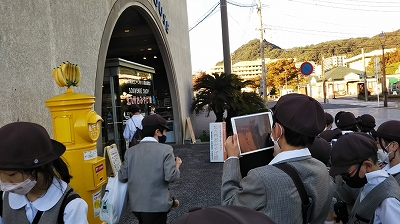 子ども達は「バナナのたたき売り」発祥の地の門司港ならではのバナナ色のポストを見つけて、写真を撮っていました。今年できた新名所です。
