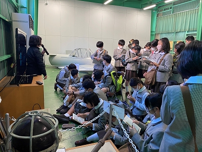 最初の見学地は宇佐市平和資料館です。映画にもなった『永遠の0』に出てきた、零式艦上戦闘機や人間爆弾とも言われた特攻専用機「桜花」を子ども達は真剣な表情で見学していました。戦地へ向かわなければならなかった若い命に思いをはせました。
