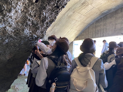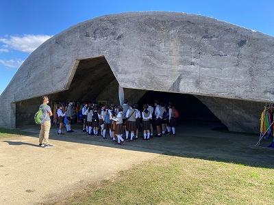 そのあとは近くの掩体壕(えんたいごう)や落下傘整備所を見学しました。掩体壕とは軍用機を敵の空襲から守るための施設です。戦争のむごさを目と肌でしっかり感じ取ることができました。
