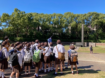 資料館を訪れた後は、爆心地公園を見学しました。この上空500メートルで原子爆弾が炸裂したという事実に子ども達は驚いていました。