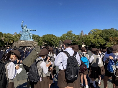 長崎駅に到着し、バスで平和公園に向かいました。原爆資料館で長崎の原爆について学びました。