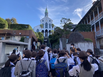 その後バスに乗って大浦天主堂へ向かいました。国宝に指定されている歴史ある美しい建物です。正式名は「日本二十六聖殉教者聖堂」で、殉教の地である西坂に向けて建てられています。天守堂の入退室の際に、一礼する児童が何人もいて、カトリックの精神が子ども達に根づいていることが感じられました。