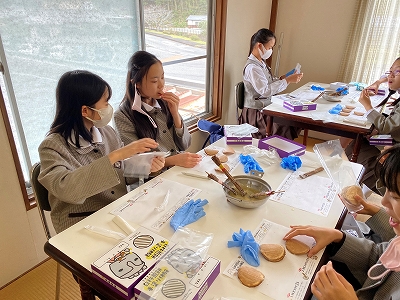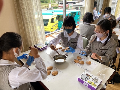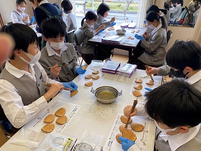その後は、後藤製菓さんで臼杵煎餅に生姜と砂糖を塗る体験をしました。早く塗らないと、固まってしまうので、手早く、丁寧に煎餅に塗っていました。そのまま試食する児童もいれば、お土産として持って帰る児童もいました。