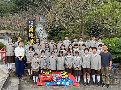 最初の活動は、別府地獄めぐりです。最初に「血の池地獄」に行きました。「血の池ってどんなだろう」とドキドキしながら向かいました。本当の血よりは薄い色でしたが、見たことのない色と大きさに皆びっくりしていました。