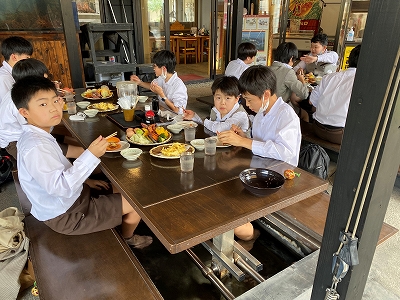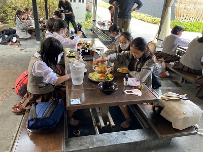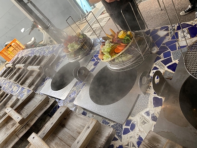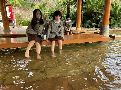 そして昼食は贅沢に足湯につかりながら地獄蒸しをいただきました。海の幸やお野菜、卵など蒸しあげられたものプラス、大分名物のとり天もいただきました。子ども達もとても満足そうでした。