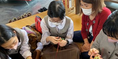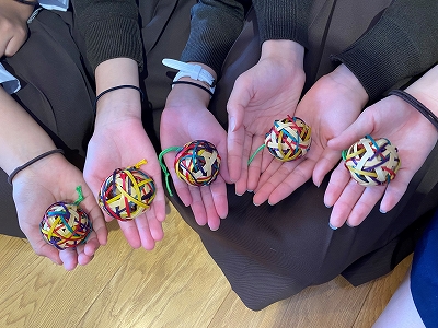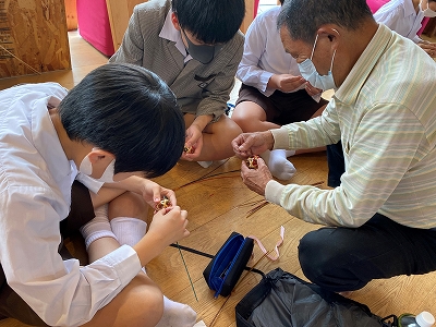その後は竹細工体験をしました。さまざまな色の竹を組み合わせて、色竹玉を作りました。最初はどんなふうに竹を組み合わせていいのか分からずに四苦八苦していましたが、慣れてくるとどんどんアレンジを加えながら見事に完成させました。