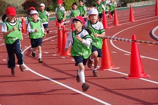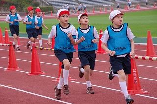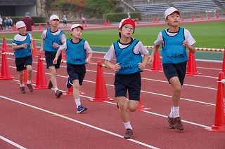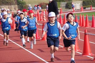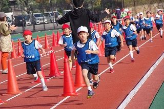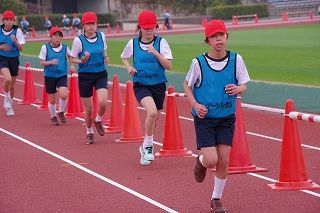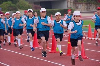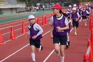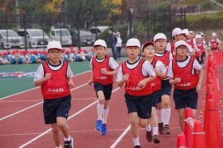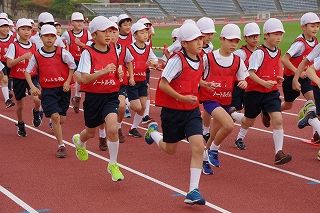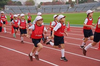 トラックを周回して、1、2年生は1250m、3、4年生は1800m、5、6年生は2300mのコースを走ります。それぞれにがんばってゴールを目指しました。