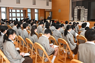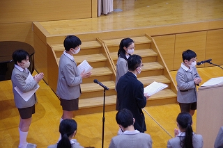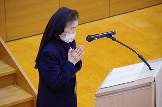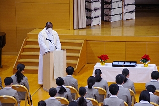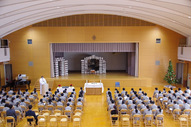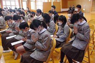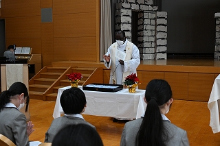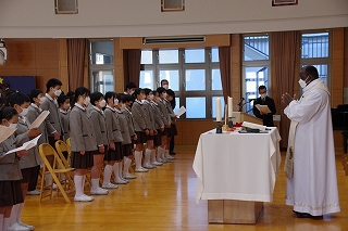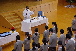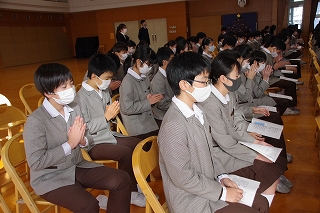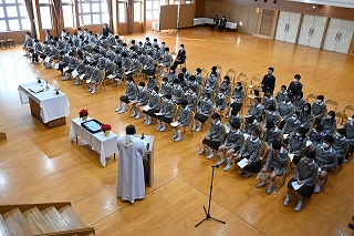 例年は聖堂で行っていますが、今年度も新型コロナウイルス感染予防の観点から、講堂で行いました。
