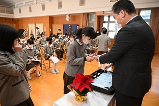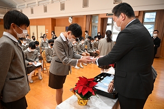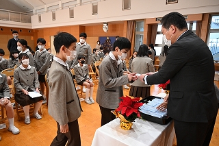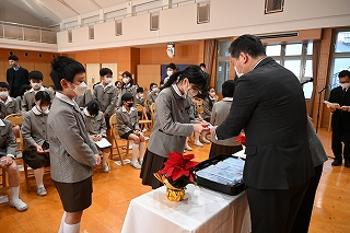 神父様に祝福していただいた十字架を一人ずつ、校長先生から受け取りました。この十字架をお守りにして、一人ひとりがこれから先の試練を乗り越えていってほしいと願っています。