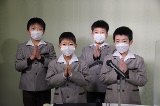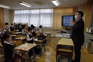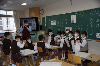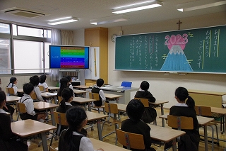 朝のテレビ放送で始業式を行いました。火曜日は English TV Broadcasting の日です。”Good morning everyone, and Happy New Year.”と放送が始まりました。共に英語で朝の祈りをささげます。