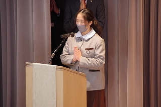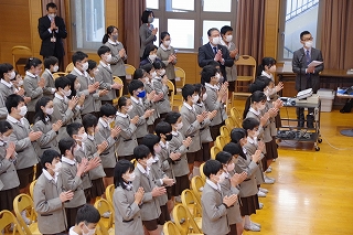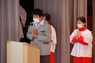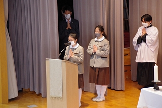 共同祈願を行いました。在校生児童代表、卒業生児童代表、教員代表、学校長の祈りにあわせ、皆で祈りました。