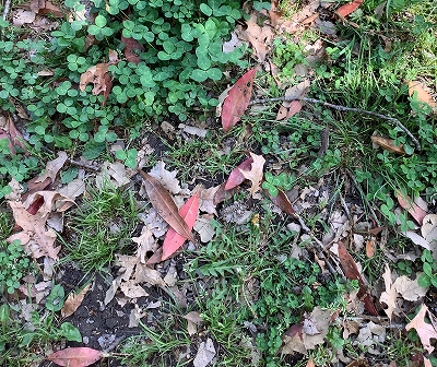 足元のクローバーの中には四葉のクローバーがありました。どこにあるかわかりますか?