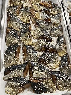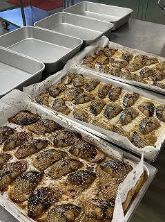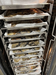 - 上からごまをふりかけます。全校児童分焼いていくので、大きなスチームコンベクションを使います。