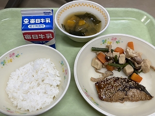 11月20日の給食です。(ご飯・アジのごま焼き・高野豆腐の含め煮・かぼちゃの味噌汁・ミルク)