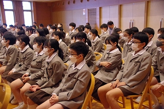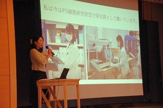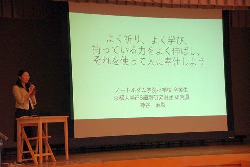 京都大学 iPS細胞研究財団 研究員 神谷 麻梨氏(本校第43回卒業生)を講師にお迎えし、「よく祈り、よく学び、持っている力をよく伸ばし、それを使って人に奉仕しよう」と題してご講演くださいました。
