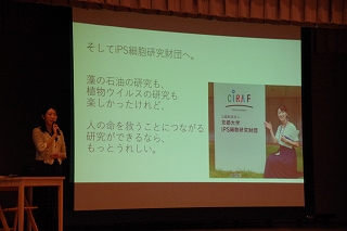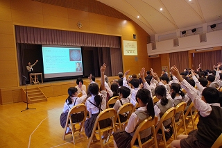 同じ制服を着た小学生の頃のお写真から始まり、子ども達にもわかりやすく、iPS細胞についてのお話をしてくださいました。「iPS細胞」の名前を知っていますかという問いかけにたくさんの手があがりましたが、今日のお話でiPS細胞がどういうものか、またどのように役に立つのか、理解を深めることができました。