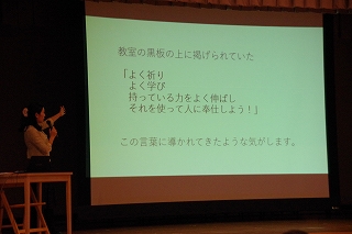 本校のすべての教室に掲げられている目標「よく祈り、よく学び、持っている力をよく伸ばし、それを使って人に奉仕しよう」の言葉に導かれてきたと話されたとおり、神谷さんはこの言葉を体現されています。