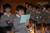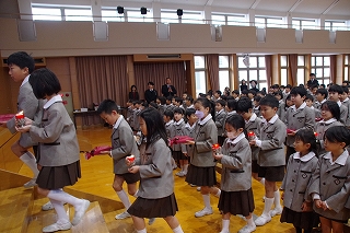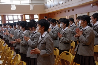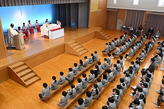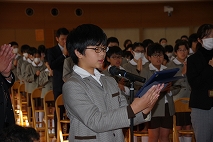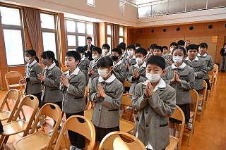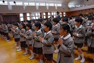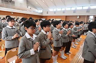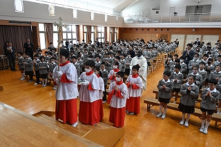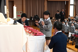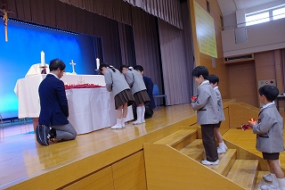 心静かに黙想し、聖歌とともに祈りのひとときが始まりました。各クラスの代表児童がろうそくとお祈りのカード(亡くなられた方々へのお手紙・ロザリオの祈りのカード)をささげます。