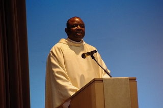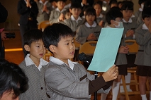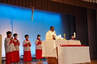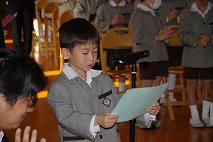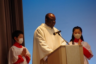 低学年の祈りの集い、高学年のミサともにヴィアトール修道会のウィリアム神父様が司式してくださいました。高学年は代表の児童が聖書朗読を行います。