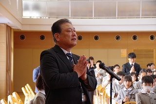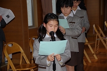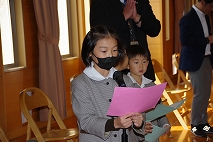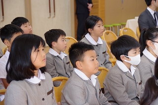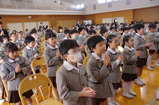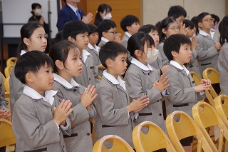 代表の児童が共同祈願を行い、先に天国へ行った方々のため、今年は特にパレスチナ自治区 ガザ地区でのイスラエル・ハマス戦闘やウクライナ侵攻で亡くなられた方々にも思いをはせて、平和を願って皆で祈りました。